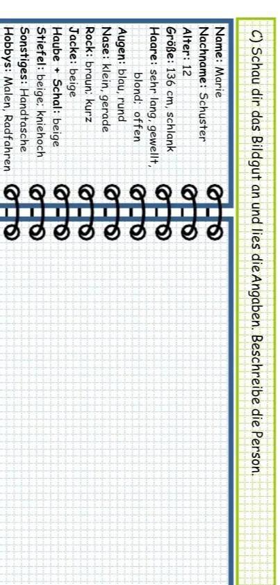 Sie ist Maria Schuster, sie ist 12 Jahre alt, sie ist schlank und nicht lang, ihre Haare ist sehr long, gewellt, offen und blond. Ihre Augen ist blau, Nase ist klein mit gerade. Ihre rock ist braun, Jacke, und Schal, Stiefel sein beige. Sie hat eine Tasche. Ihre Hobbys sind Malen und Radfahren.