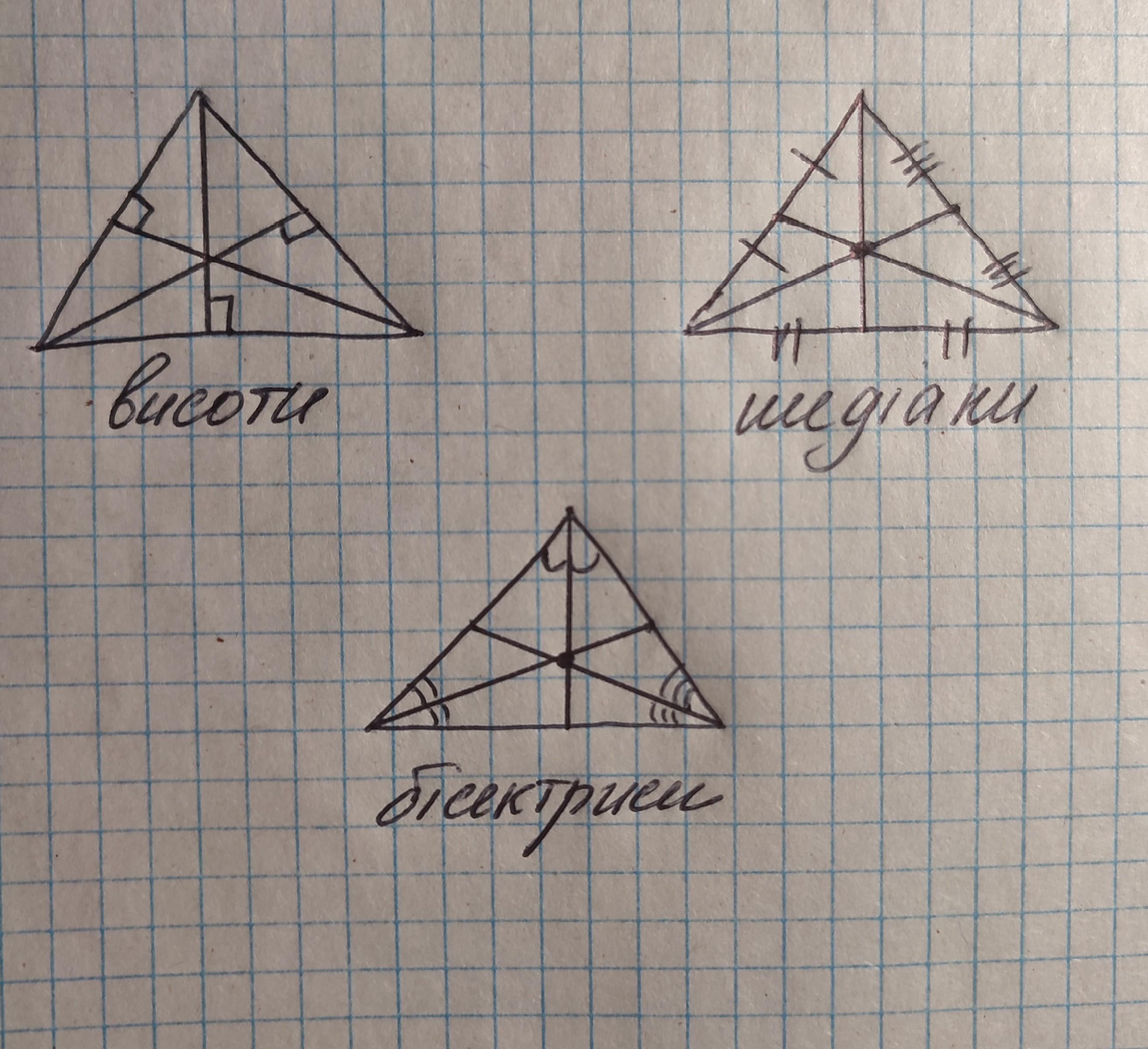 Побудувати три гострокутні трикутники: в першому провести три медіани, в другому провести три висоти, в