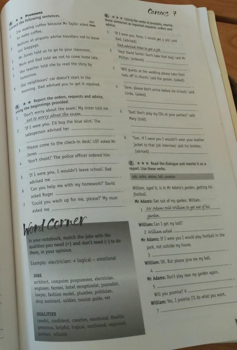 2 their baggage 3 to our classroom 4 told us 5 told her 6 advised them