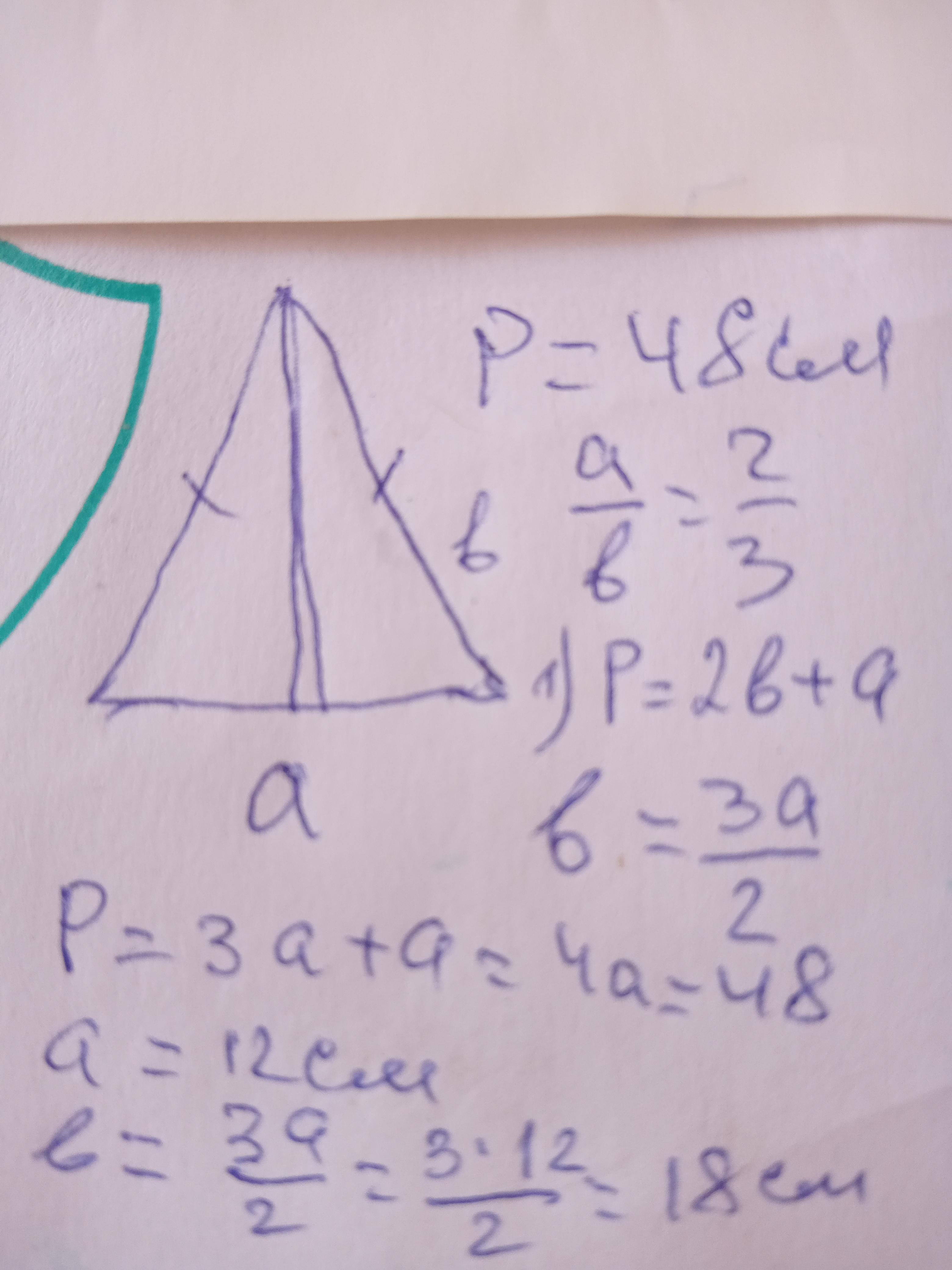 8.У рівнобедреному трикутнику з периметром 48см основа вiдноситься до бічної сторони як 2:3. Знайдіть сторони трикутника.. пожалуйста решите даю 100 балов