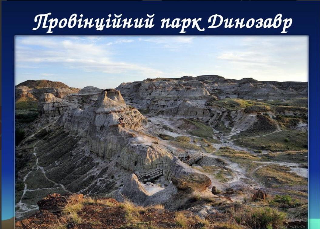 Провінційний парк Динозавр Провінційний парк «Динозавр» - розміщений приблизно за 200 км від міста Калгарі . Парк лежить в долині річки Ред Дір, яка відома своєю незвичною змінною топографією. Парк знаменитий тим, що це одне скам'янілостей динозаврів у 3 найбільших сховищ світі. Знайдено 40 видів скам'янілостей та виставлено понад 500 екземплярів у багатьох музеях світу. Знаменита збірка викопних решток, що налічує близько 500 рiзних скам'янілих мікроскопічних спор папороті до живих організмів, від величезних м'ясоїдних динозаврів, до всесвітньої спадщини Юнеско віднесенена у 1979 році.