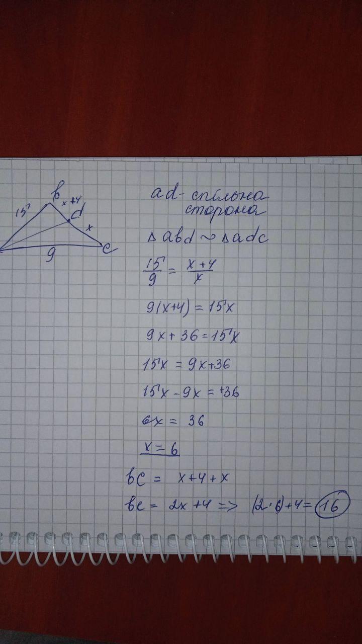 бісектриса ad трикутника abc ділить сторону bc на відрізки довжина одного з яких на 4 см менша ніж довжина другого. чому дорівнює сторона bc якщо ab=15см ac=9см