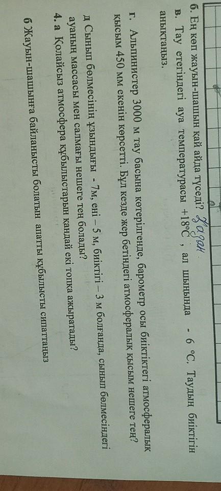 в. Тау етегіндегі ауа температурасы +18°С, ал шыңында - 6 °C. Таудың биікті аныктаныз. г. Альпинистер 3000 м тау басына көтерілгенде, барометр осы биіктіктегі атмосферал қысым 450 мм екенін көрсетті. Бұл кезде жер бетіндегі атмосфералык кысым нешеге тең д Сынып белмесінің ұзындығы - 7м, ені - 5 м, биіктігі - 3 м болганда, сынып белмесiнд ауаның массасы мен салмағы нешеге тең болады? 4. а Колайсыз атмосфера кұбылыстарын кандай екi топка ажыратады? б Жауын-шашынға байланысты болатын апатты кұбылысты сипаттаңыз