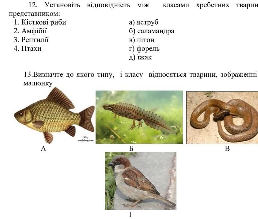 а) класс: лучепёрые рыбы тип: карповые б) класс: земноводные тип: - в) тип: офидии класс: змеи г) класс: птицы тип: хордовые