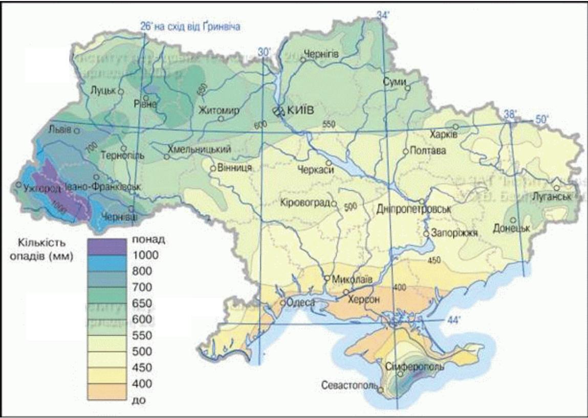 Карпати, Кримські гори і північний схід країни знаходяться в районі надмірного зволоження, центр країни в районі достатнього зволоження, а південь і південний схід в районі недостатнього зволоження, так як збільшується континентальність клімату (зменшується кількість опадів і збільшується амплітуда середньорічних температур)