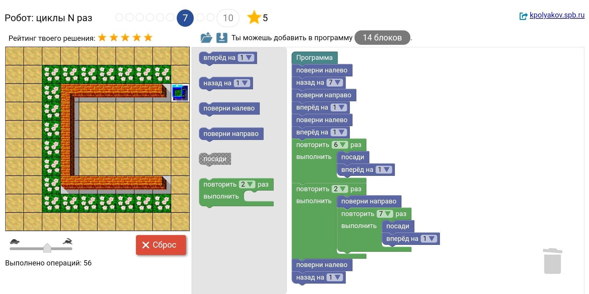 - воспользуемся двумя циклами вложенными один в другой (т.к. можно использовать всего 2 блока посади) и посадим грядки на вертикальном ряду и верхнем горизонтальном ряду