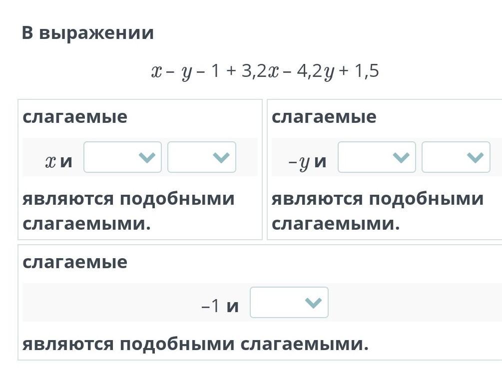В выражении слагаемые хи x-y-1 +3,2x4,2y + 1,5 являются подобными слагаемыми. слагаемые -1 и слагаемые -уи являются подобными слагаемыми. являются подобными слагаемыми.