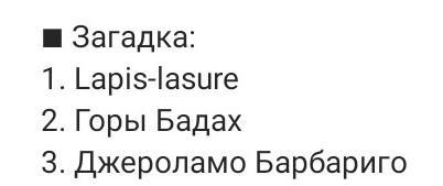■ Загадка: 1. Lapis-lasure 2. Горы Бадах 3. Джероламо Барбариго