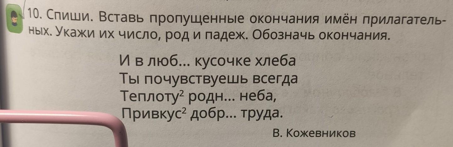 10. Спиши. Вставь пропущенные окончания имён прилагатель- ных. Укажи их число, род и падеж. Обозначь окончания. И в люб... кусочке хлеба Ты почувствуешь всегда Теплоту2 родн... неба, Привкус² добр... труда. В. КожевнИКОВ --помогите с упражнением пж