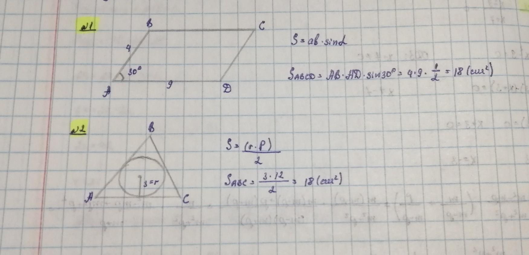 1. Знайди площу паралелограма, сусідні сторони якого дорівнюють 9 см і 4 см, а кут між ними 30°