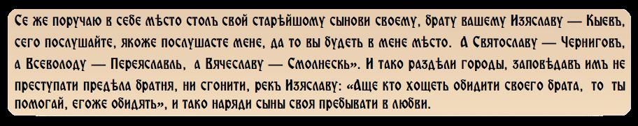 Після своєї смерті (1054 рік) Ярослав залишив велику та могутню країну, 5 синів та новий принцип спадкування престолу. За «вертикальним» принципом у Києві мав би почати княжити Ростислав Володимирович – єдиний син старшого сина Ярослава, котрий помер у 1052 році. Але згідно з новим принципом київським князем став найстарший живий Ярославович – Ізяслав. «Повість» наводить слова батька своїм синам напередодні смерті: