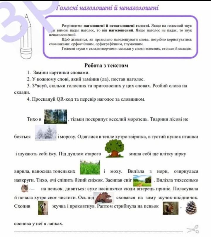 1. Заміни картинки словами. 2. У кожному слові, який замінив (ла), постав наголос. 3. 3*ясуй, скільки голосних та приголосних у цих словах. Розбий слова на склади. 4. Проскануй QR-код та перевiр наголос за словником. Тихо в бояться тільки поскрипує веселий морозець. Тварини лісові не і морозу. Одяглися в тепле хутро звірятка, в густий пушок пташки миша собі ще влітку нірку і шукають собі їжу. Під дуплом старого і моху. Вилізла з нори, озирнулася Вилiзла тихесенько на пеньок, дивиться: сухе насіннячко сюди вiтерець приніс. Поласувала вирила, наносила тоненьких навкруги. Тихо, очi слiпить білий сніжок. Засипав снiг й почала хутро своє чистити. Ось пiд Схопив сховався на зиму жучок-шкідничок. жучка і проковтнув. Раптом стрибнула на пеньок соснова у неї в лапках.