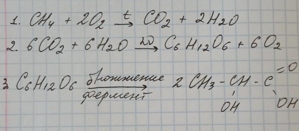 вуглекислий газ -> глюкоза -> молочна кислота -> калієва сіль молочної кислоти