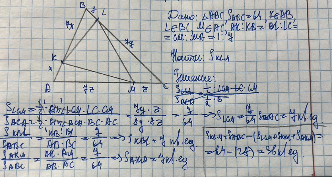 На сторонах AB, BC и CD треугольника ABC взяты точки K, L и M соответственно. Известно, что AK:KB = BL:LC = CM:AM = 1:7. Найдите площадь треугольника KLM, если площадь треугольника ABC равна 64.