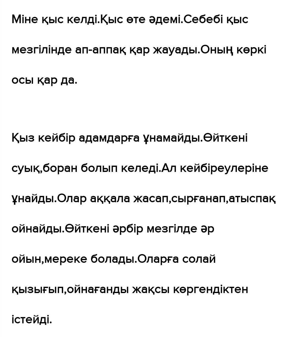 Міне қыс келді.Қыс өте әдемі.Себебі қыс мезгілінде ап-аппақ қар жауады.Оның көркі осы қар да.