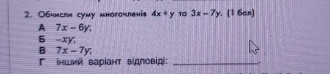 2. Обчисли суму многочленів 4х + у то 3х -7y. (1 бал) A 7x-6y; Б -Ху; B 7x-7y L iнший варіант відповіді: