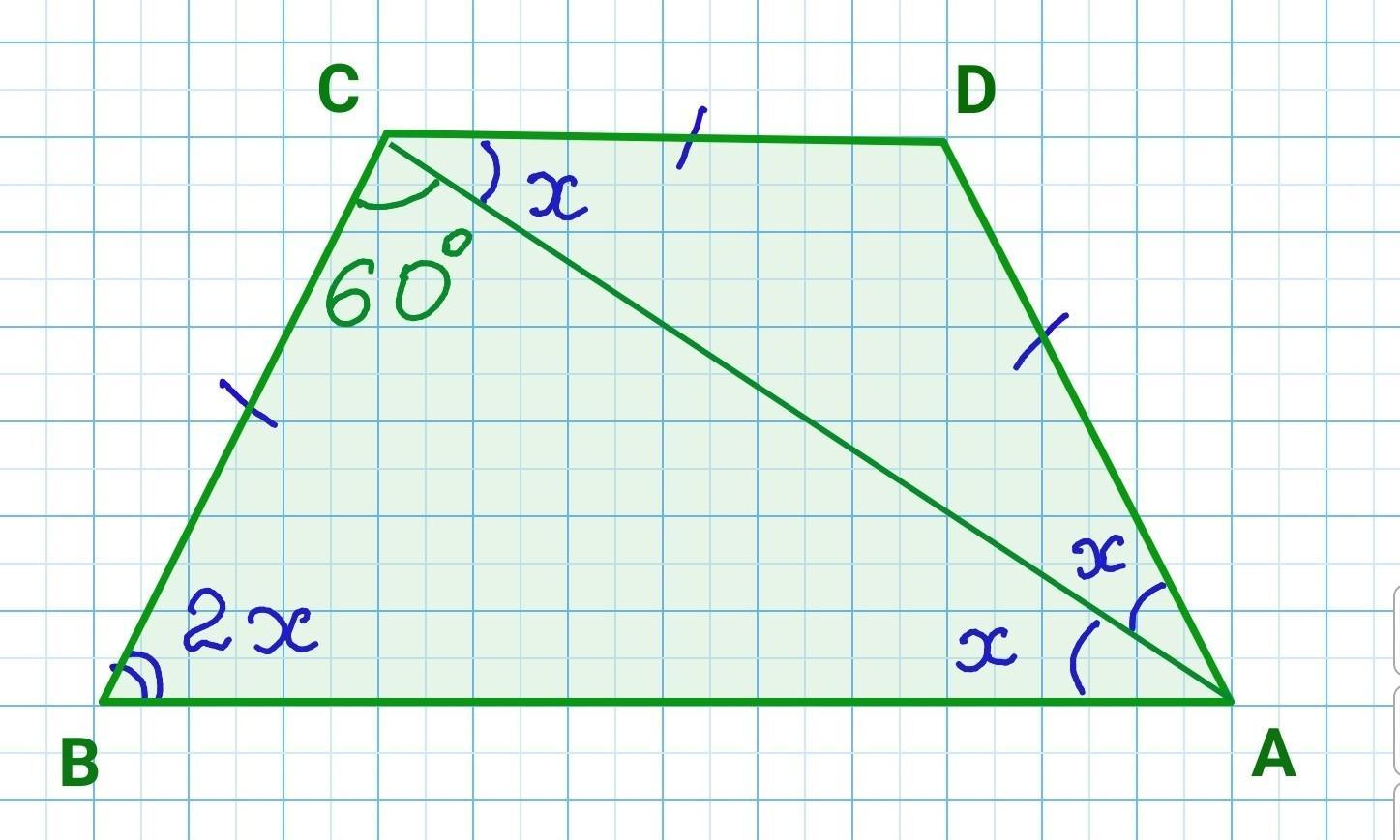 У рівнобічній трапеції СД менша основа, СД=АД. <АСВ=60⁰. Визначити гострий кут трапеції. Много баллов!!!!