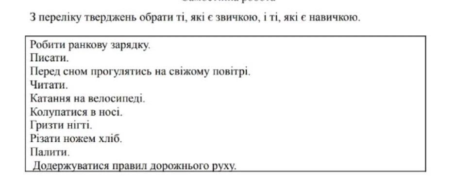 З переліку тверджень обрати ті, які є звичкою, і ті, які є навичкою. i Робити ранкову зарядку. Писати. Перед сном прогулятись на свіжому повітрі. Читати. Катання на велосипеді. Колупатися в носі. Гризти нігті. Рiзати ножем хліб. Палити. Додержуватися правил дорожнього руху.