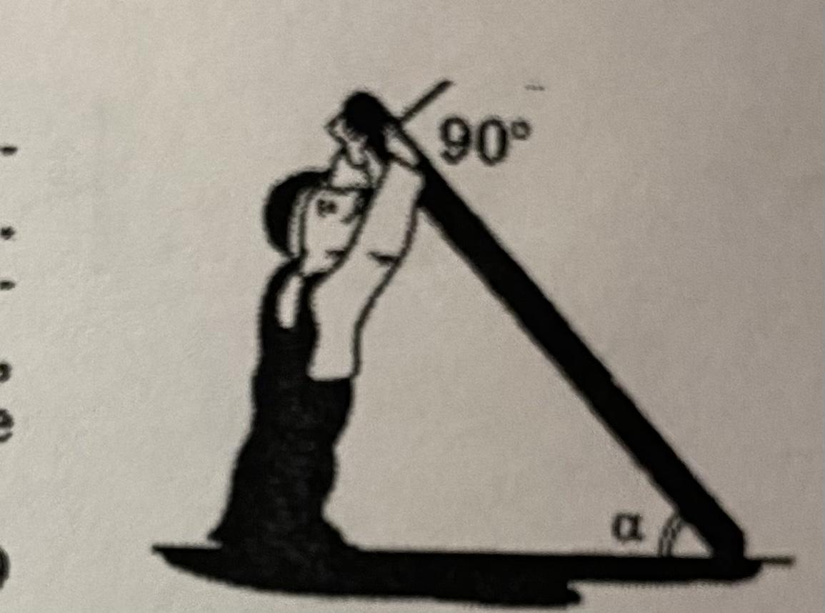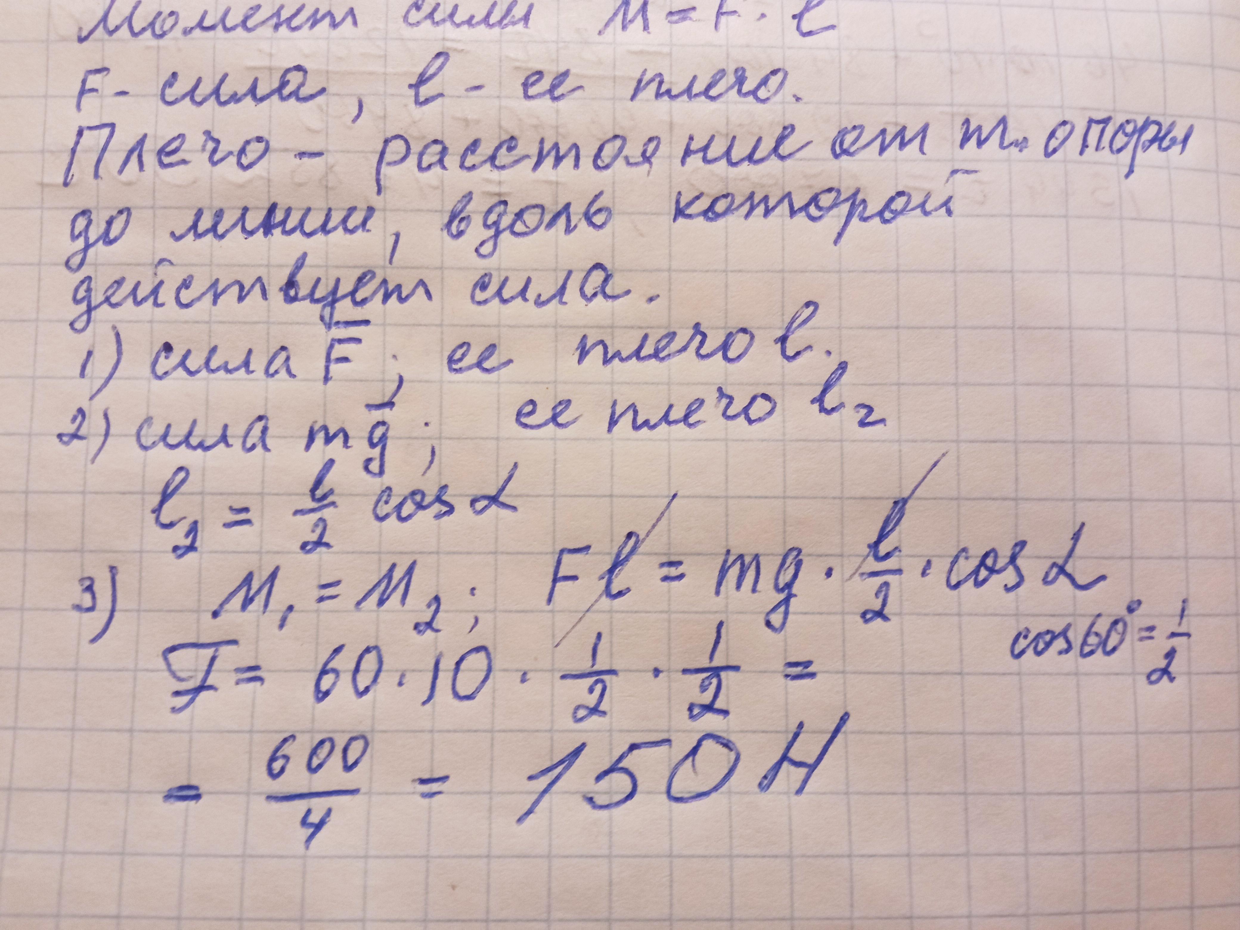 Рабочий поднимает трубу, прикладывая силу так, как показано на рисунке. Масса трубы равно 60 кг. В тот момент, когда труба составляет угол альфа=60° с поверхностью земли, сила, прикладываемая рабочим, равна F (Ньютона) . Определите значение F