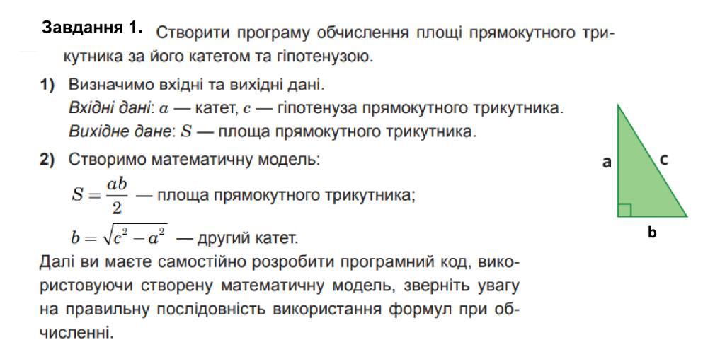print(f'Длина другого катета: {b}; Площадь: {S}')