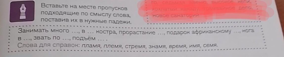 занимать много времени, в пламени костра, прорастание семени, подарок африканскому племени, нога в стремени , звать по имени, подъем знамени