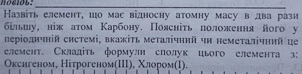 6. Назвiть елемент, що має відносну атомну масу в два рази більшу, ніж атом Карбону. Поясніть положення його у періодичній системі, вкажіть металічний чи неметалічний це елементи. Складіть формули сполук цього елемента 3: Оксигеном, Нітрогеном(III), Хлором(1).Срочно