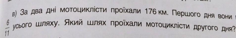 розвяжи задачу За два дні мотоциклісти проїхали 176 км. Першого дня вони проїхали 6/11 усього шляху. Який шлях проїхали мотоциклісти другого дня?