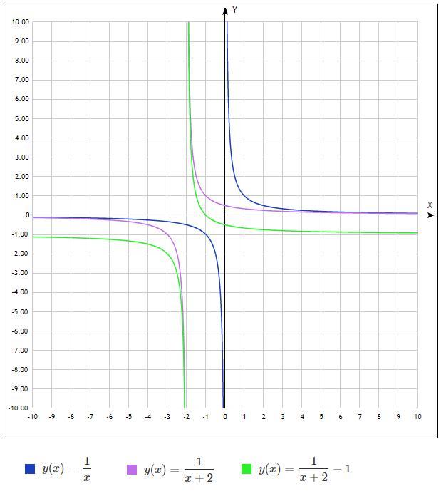 при увеличении х на 2-график гиперболы сдвигается влево по оси х на 2, при вычитании 1-график опускается вниз по оси у на 1