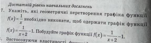 укажите, какие геометрические преобразования графика функции f(x)=1/x необходимо выполнить, чтобы получить график функции f(x)=1/x+2-1. Постройте график функции f(x)=1/x+2-1.
