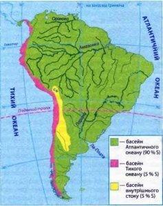 як видно з карти, яка наведена нижче, більшість річок Південної Америки належать до басейну Атлантичного океану.