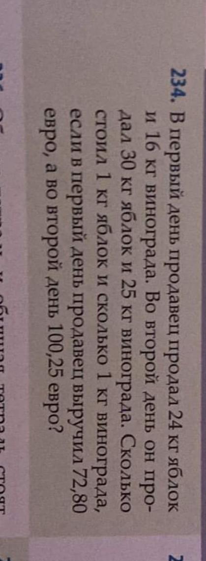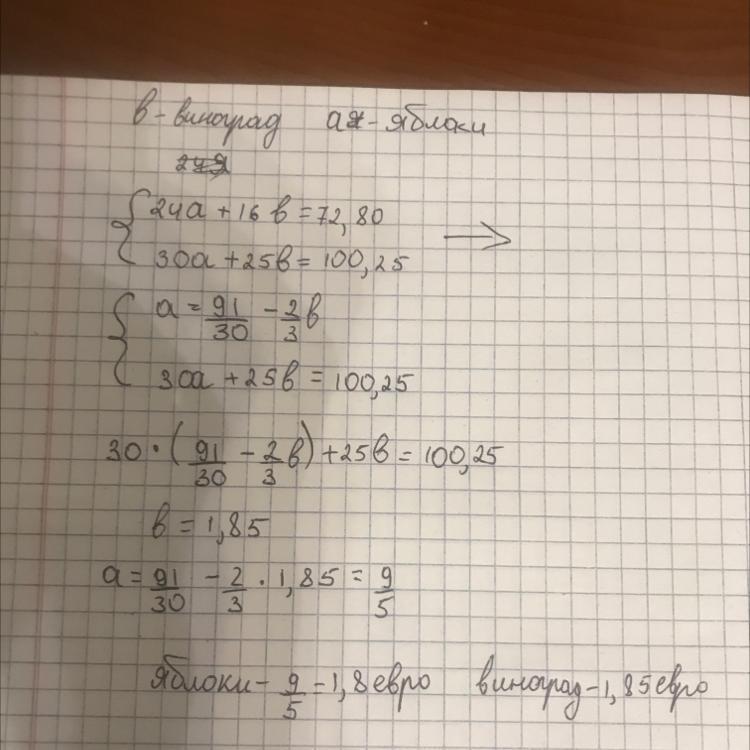 Ответ: 1 кг яблок стоил 1,80 евро и 1 кг винограда стоил 1,85 евро.
