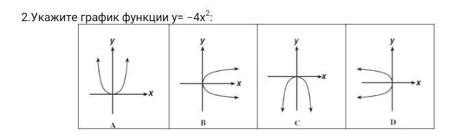 данный график функции имеет вид у=ах^2. первая направлена вверх(ее ветви), не подходит так как коэффициент отрицателен(а<0). третья подходит, так как коэффициент отрицателен, а значит парабола направлена вниз (ее ветви).