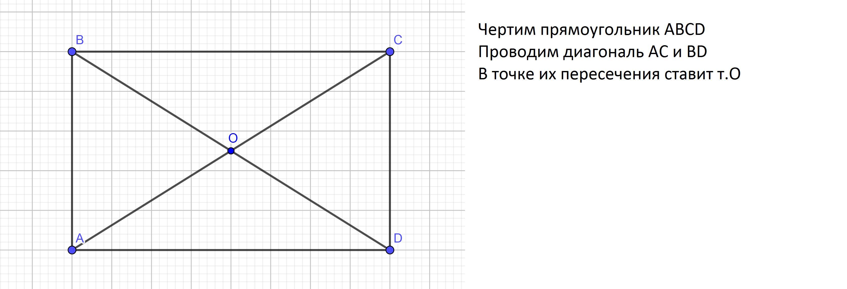 Черти прямоугольник АВСД, проведи диагонали АС и ВД и в точке пересечения поставь букву О