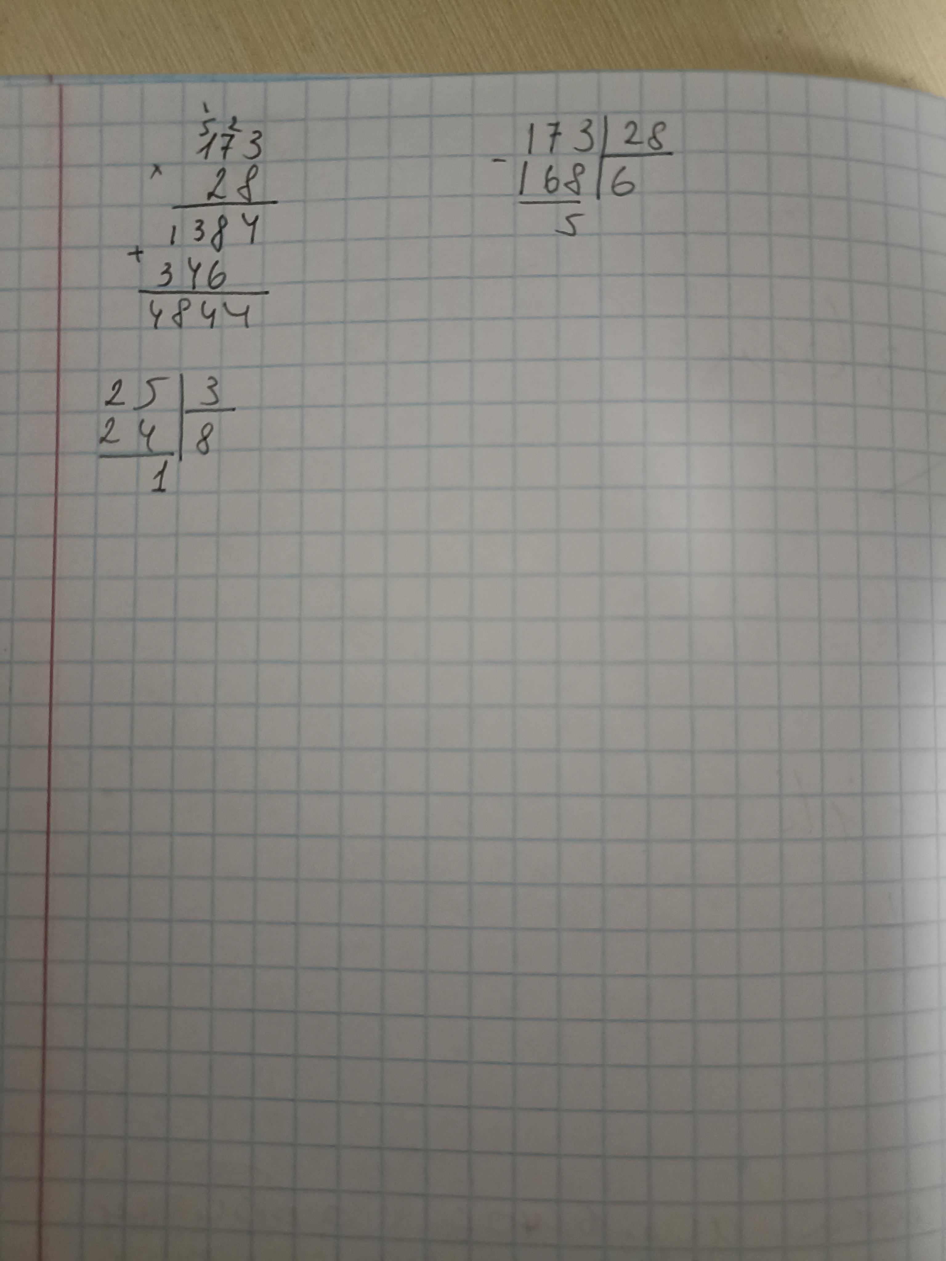 173*28 столбиком, и 173/28, столбиком, и другой любой пример на деление, что бы была остача,столбик!