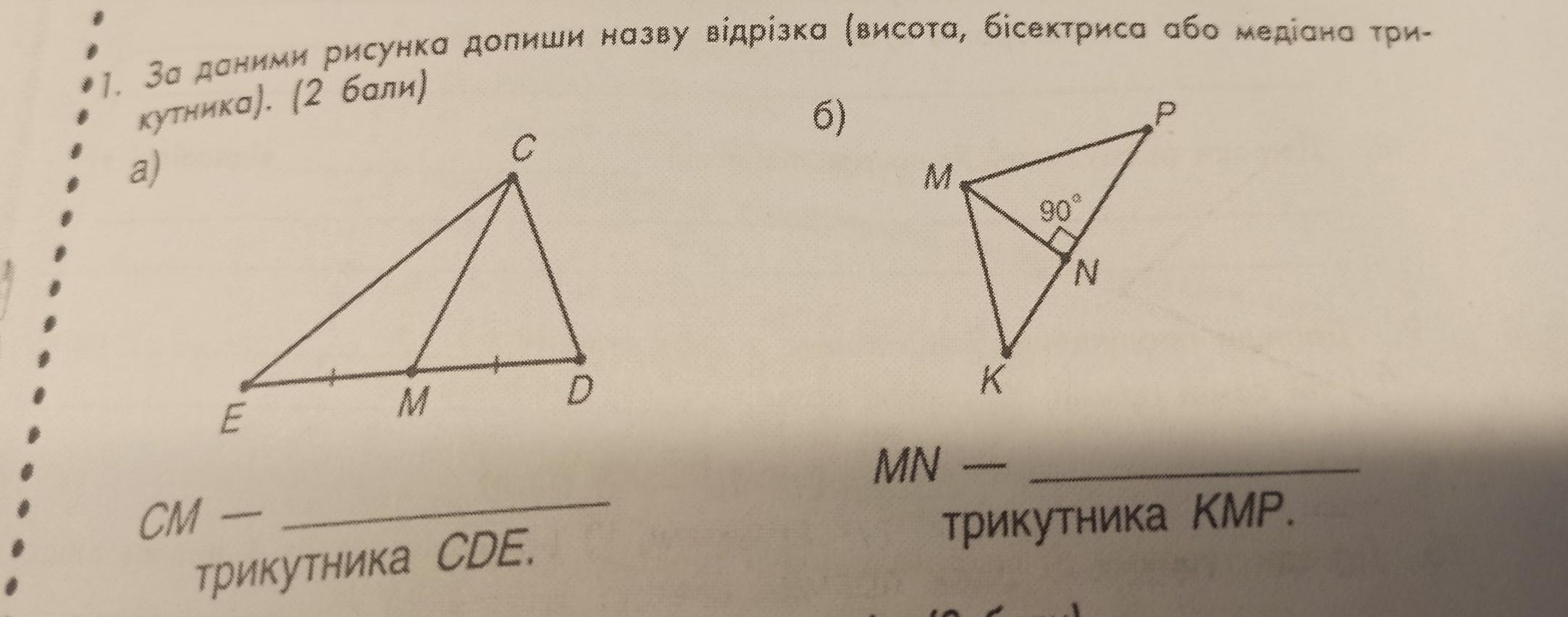 1. За даними рисунка допиши назву вiдрiзка (висота, бісектриса або медіана три- кутника). (2 бали)