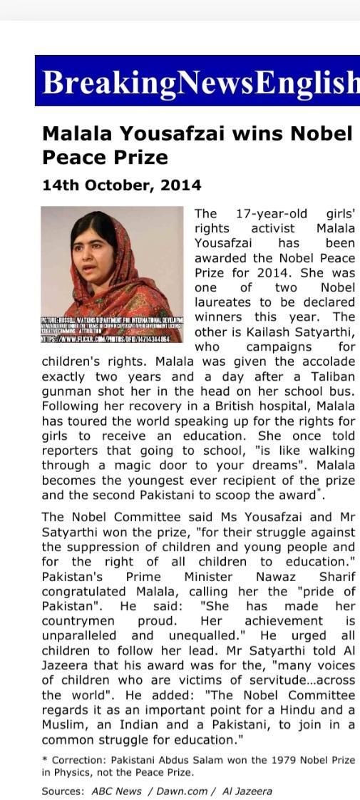 "Малала становится самым молодым в истории лауреатом премии и вторым пакистанцем, получившим эту награду".