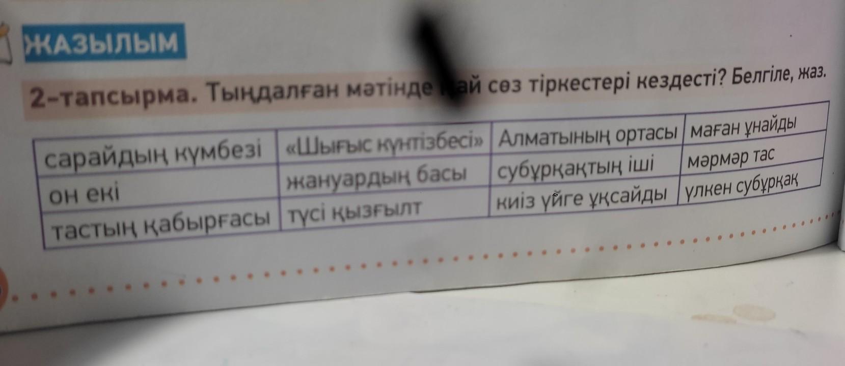КАЗЫЛЫМ -тапсырма. Тындалған мәтiнде қай сөз тіркестерi кездестi? Белгiле, жаз арайдың күмбезі «Шығыс күнтізбесі» ч екi жануардың басы стың қабырғасы түсі қызғылт Алматының ортасы маған ұнайды субұрқақтың іші мәрмәр тас киіз үйге ұқсайды улкен субуркак
