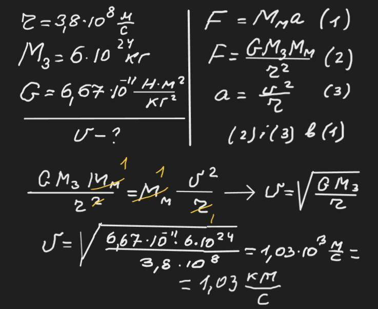 З якою середньою швидкістю рухається Місяць навколо Землі, якщо середня відстань від Землі до Місяця 3,8·108 м, маса Землі 6·1026 кг?