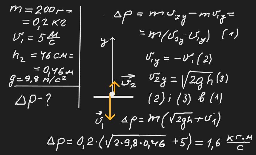 Кулька масою 200 г що падала вертикально, вдарилась об підлогу зі швидкістю 5 м/с і підстрибнула на висоту 46 см. Знайти зміну імпульсу кульки під час удару.