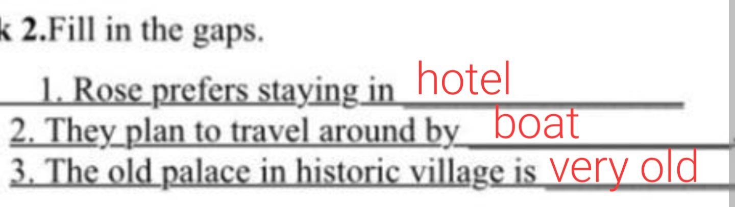Task 2.Fill in the gaps. 1. Rose prefers staying in 2. They plan to travel around by 3. The old palace in historic village is