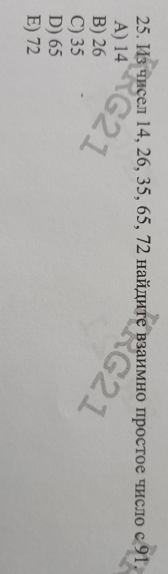 вза G21 25. Из чисел 14, 26, 35, 65, 72 найдите взаимно простое число с 91 чис G21 A) 14 B) 26 C) 35 D) 65 E) 72