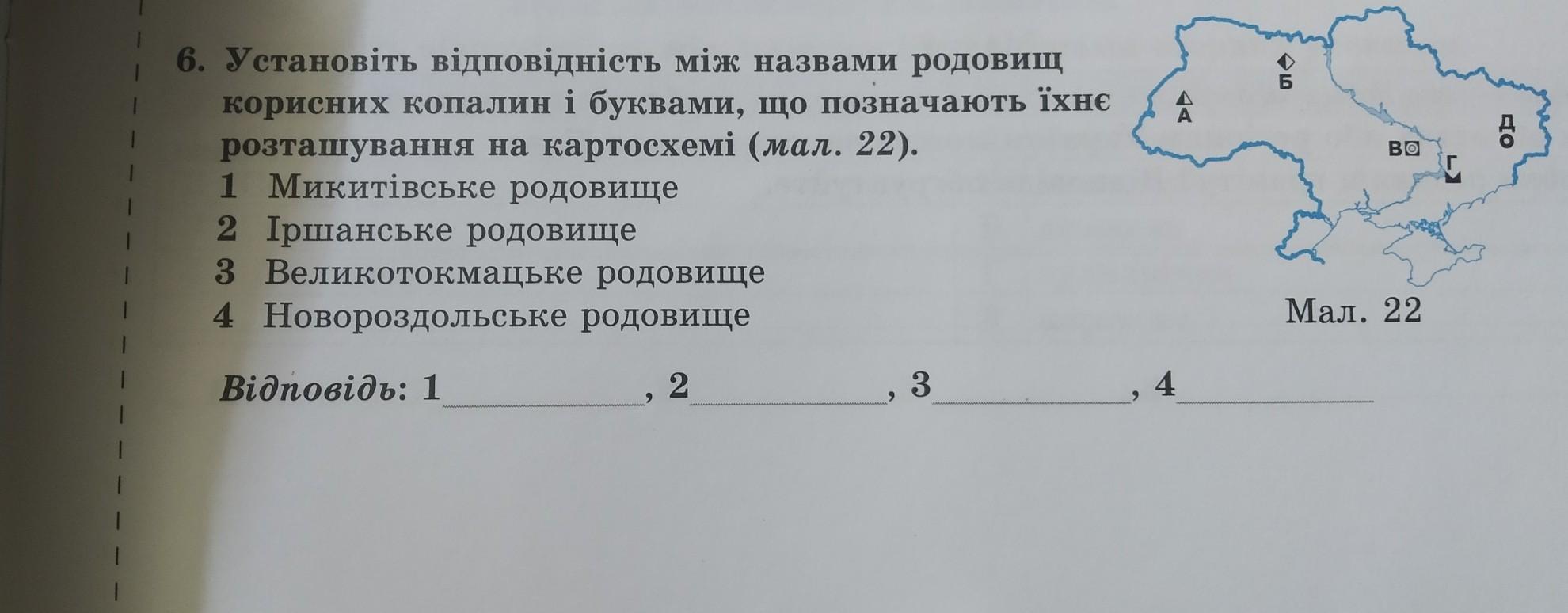 Установіть відповідність між назвами родовищ корисних копалин і буквами, що позначають їхнє розташування на картосхемі (ДУЖЕ ТЕРМІНОВО)