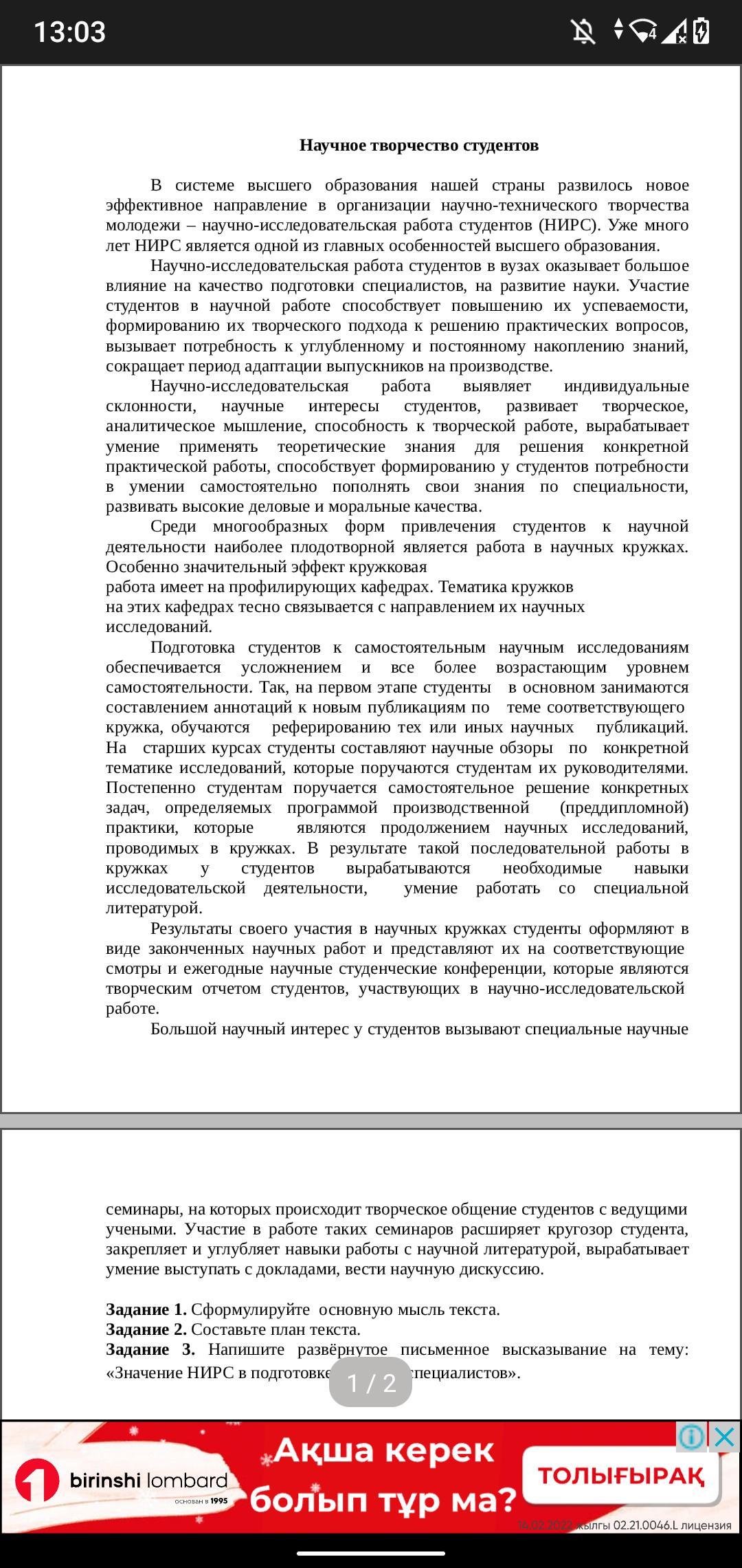 Задание 1. Сформулируйте основную мысль текста Задание 2. Составьте план текста.