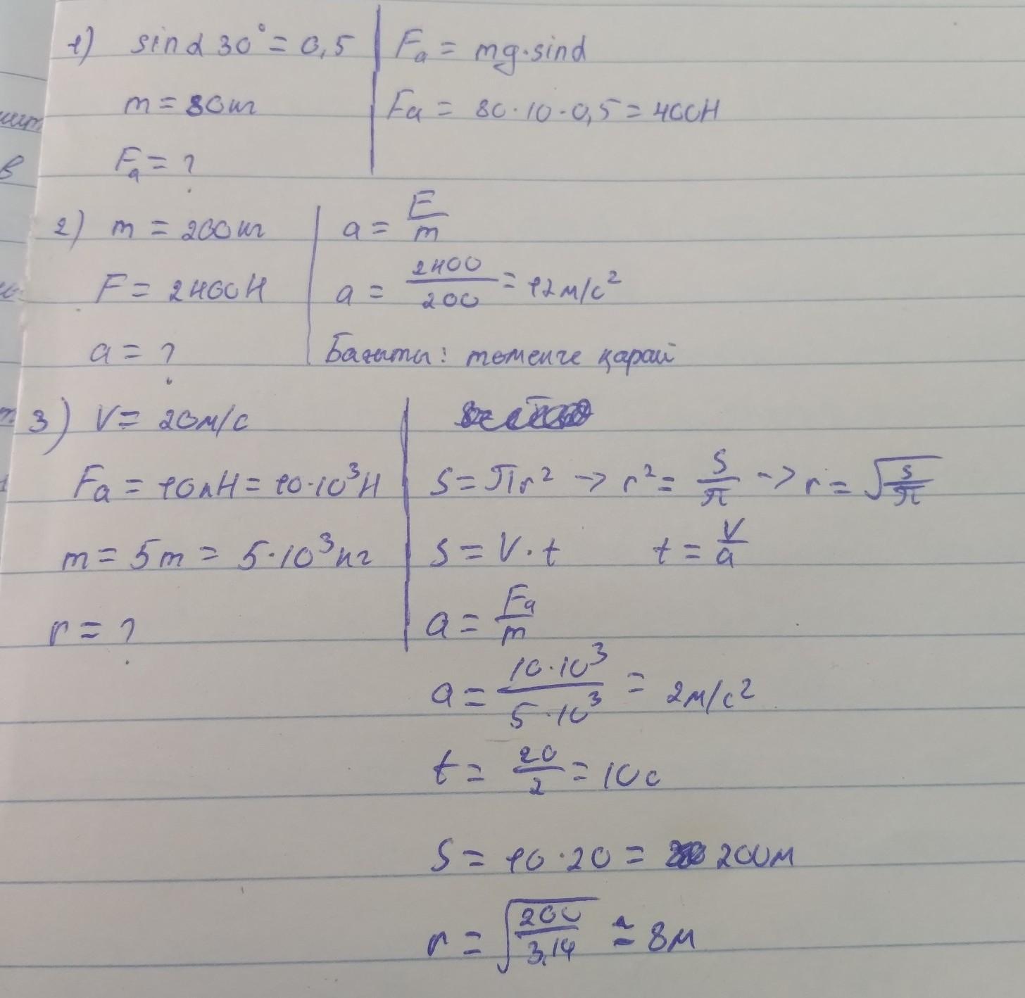 Есептерді шығарғанда еркін түсу үдеуін g = 10 м/с² деп алындар. 1. Келбеулiгi 30° жазықтық устiнде тұрған массасы 80 кг адамның салмағын аныктандар. 2. Массасы 200 кг жук төмен түсіп келе жаткан лифтiде тур. Осы кезде ол еденге 2400 Н кысым тусiредi. Лифтiнiн удеуiн және багытын анықтаңдар. 3. Денес кепiрдiң үстiнгi нуктесiнен 20 м/с жылдамдыкпен етiп бара жаткан автомобильдiн салмагы 10 кН. Автомобильдiң массасы 5 т болса, кепiрдiн қисықтық радиусы неге тең? "Книга предоставлена исключительно в образовательных целях согласно Приказа Министра образования и науки Республики Казахстан от 17 мая 2019 года № 217 Все учебники Казахстана на OKULYK.KZ 105 ■4. Қисықтық радиусы 40 м деңес кепiрдiң үстiнгi нүктесінен етіп бара жатқанда салмақсыздық күйде болу ушiн автомобильдiн жылдамдығы қандай болу керек?