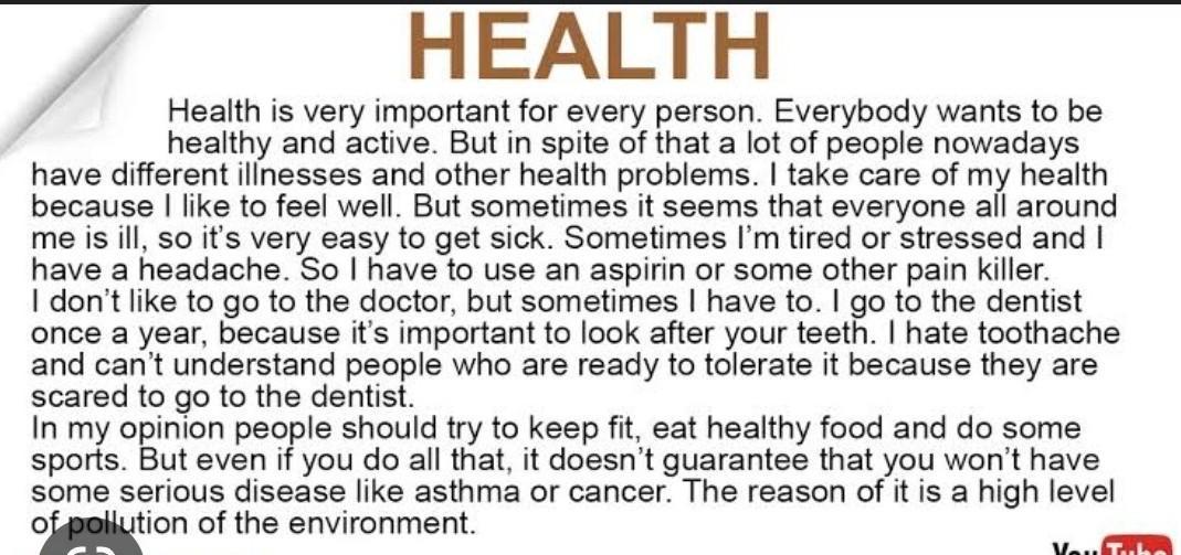 nobody likes visiting a doctor. however, when people feel sick they make an appointment with a doctor, send for a doctor or, in most serious cases, call an ambulance. for such illnesses as flu, cold, hay fever, food poisoning, you can buy either some medicine from the chemist, or have a prescription made up. undoubtedly, all of the illnesses have different symptoms. for instance, if you have a sore throat, sneezing and cough, it is obvious that you have caught a cold. but when you are running a high temperature and have symptoms for cold, you've got flu. let us try to make another diagnosis. if you feel sick, want to vomit and have a stomachache, you must have got a food poisoning. many people are afraid of dentists. however, it is essential to see your dentist for a regular checkups and cleaning. it will help to prevent dental caries. besides, doctors recommend that people should brush their teeth each time after meals. anyway, when people have a toothache they should make an appointment with a doctor as soon as it is possible. the doctor will use a local anesthetic to the area around the tooth and fill the cleaned out cavity or pull it out