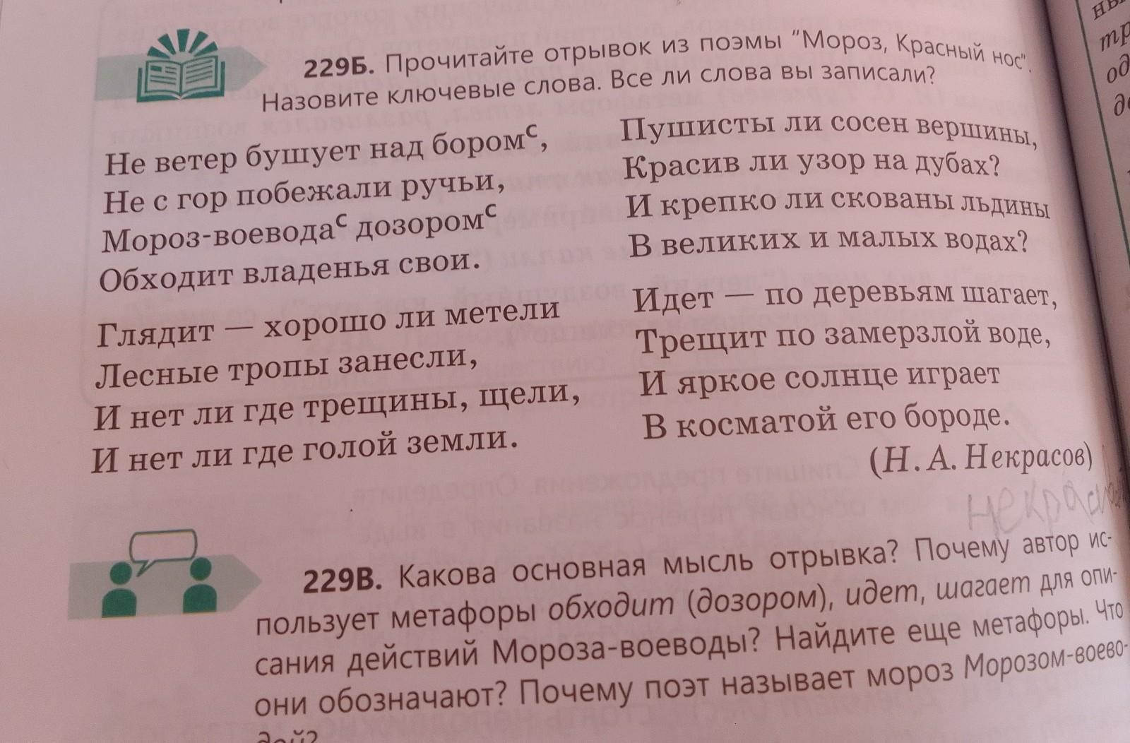 229В. какова основная мысль отрывка? почему автор использует метафоры обходит (дозором), идёт, шагает для описаний действий Мороза-вовеводы? найдите ещё метафоры. что они обозначают? почему поэт называет мороз Морозом-воеводой?