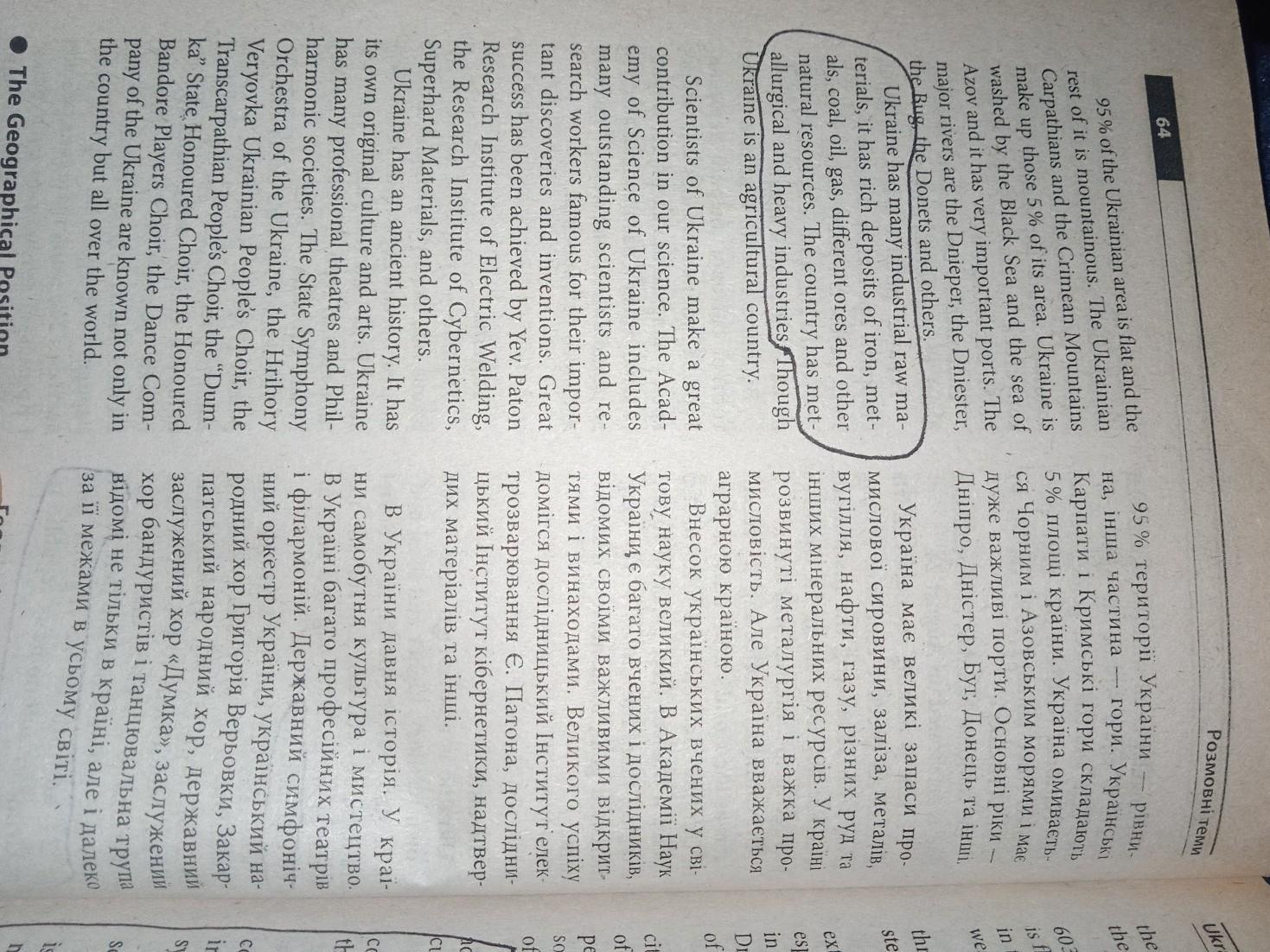 Ответ: Ukraine is like a picturesque picture, which depicts all the beauty of our nature. In our country there are many customs and rites for various national and religious holidays. The flag is an honor of our state. The blue sky above the golden field is the meaning of our flag. There are many beautiful cities in Ukraine that have their own legends. Ukraine is also rich in rivers. Our river resembles a colorful rainbow under a blue sky. If you get to our country, you will understand that Ukraine is called the granary of Europe for a reason. You will be amazed by the beauty of our golden fields that sprout above the sky.