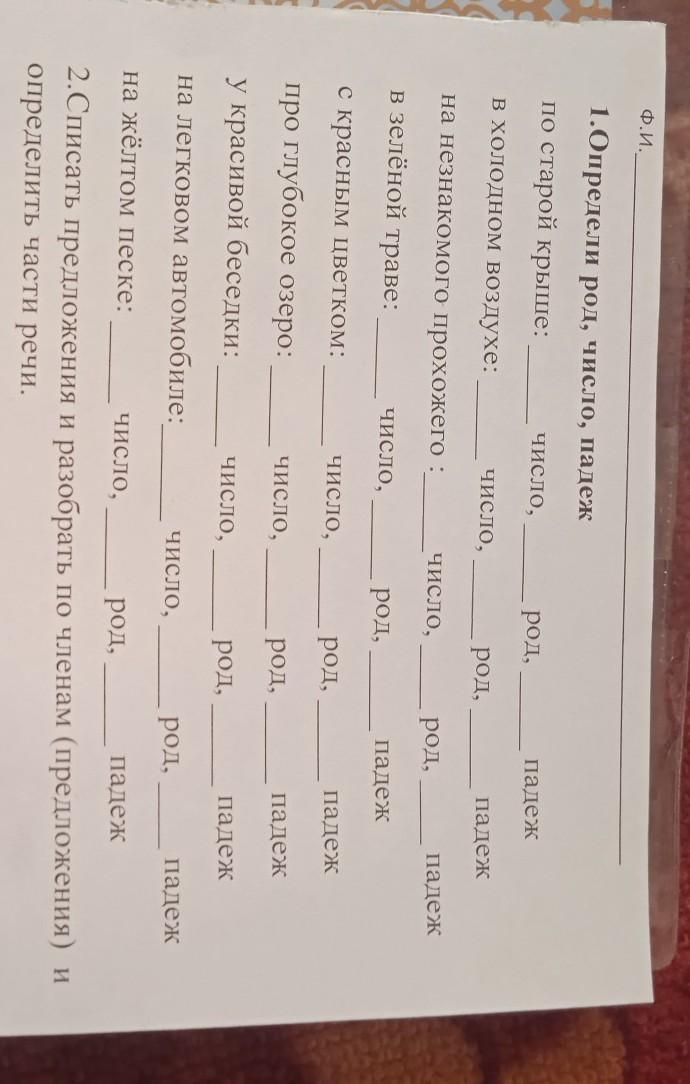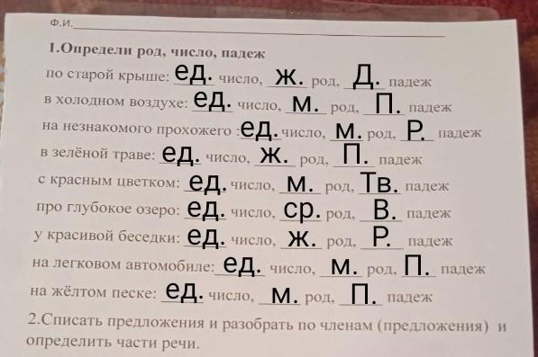 1.Определи род, число, падеж по старой крыше: в холодном воздухе: на незнакомого прохожего : в зелёной траве: число, с красным цветком: про глубокое озеро: у красивой беседки: на легковом автомобиле: на жёлтом песке: число. число, число, число, число, число, род, число, род, число, род, род, род, род, род, падеж род, падеж падеж род, падеж падеж падеж падеж падеж падеж