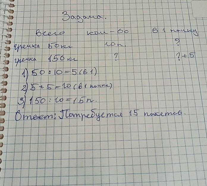 Реши задачи. ДОМАШНЕЕ ЗАДАНИЕ 50 кг гречки расфасовали поровну в 10 паке- тов. Сколько пакетов потребуется, чтобы рас- фасовать 150 кг гречки, если в каждом пакете крупы будет на 5 кг больше?
