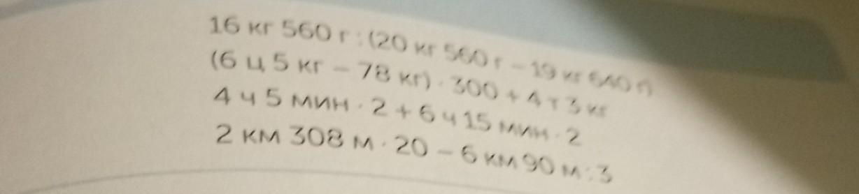 16 кг 560 г: (20 кг 560 г - 19 кг 640 п (6 ц 5 кг - 78 кг) - 300 +413 кг 4 ч 5 мин. 2+64 15 мин 2 2 км 308 м. 20 - 6 км 90 м:3